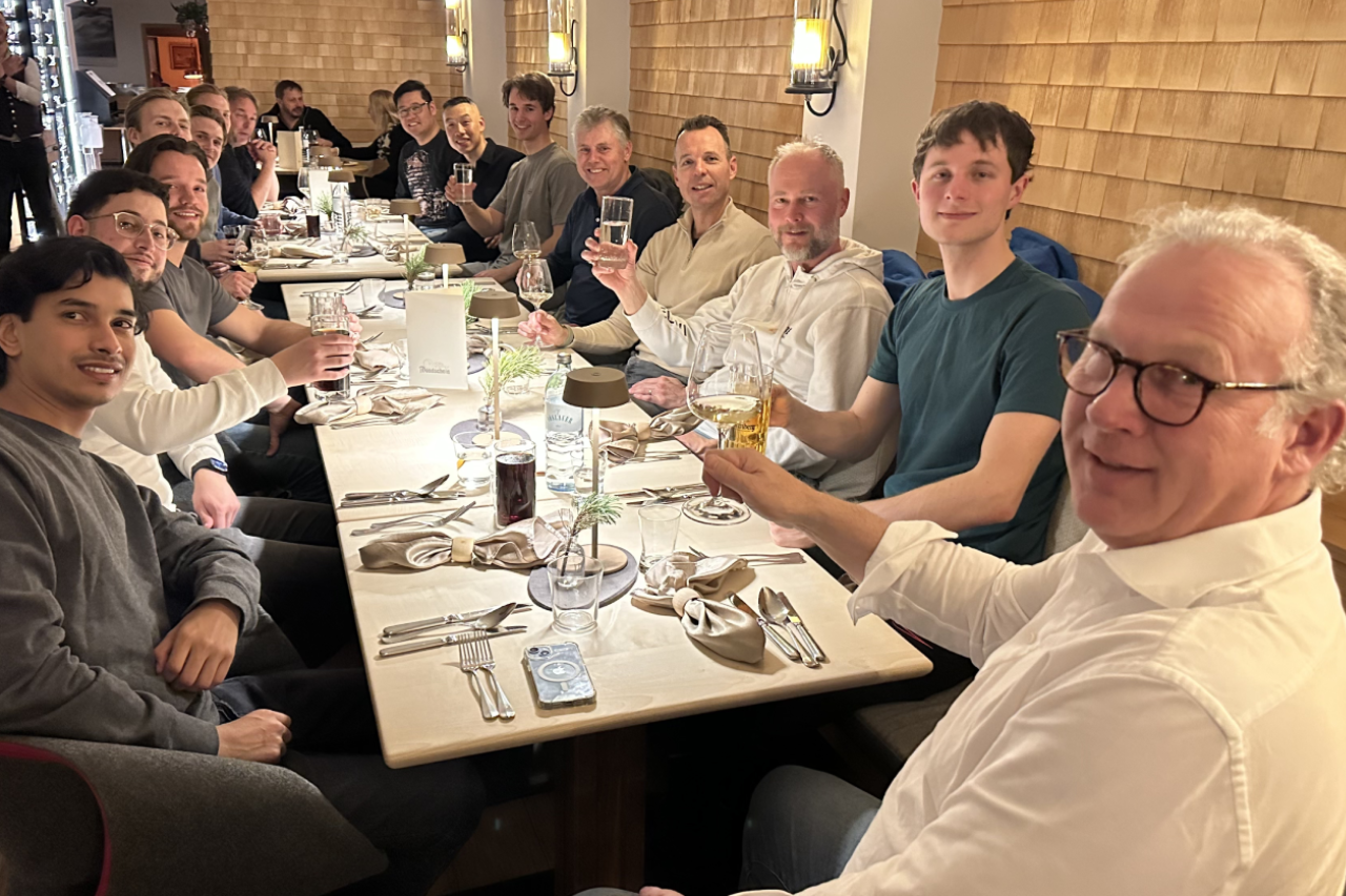 Zondag begon met sneeuwval: een mooie laag verse sneeuw, al zorgde het soms voor beperkt zicht. Dat maakte de afdalingen uitdagender, maar ook extra leuk. Met koffiepauzes en een uitgebreide lunch tussendoor hield iedereen het goed vol. Het voelde als pure wintersport: winterse omstandigheden, teamwork op de piste en veel gezelligheid.Après-ski en teamgevoel